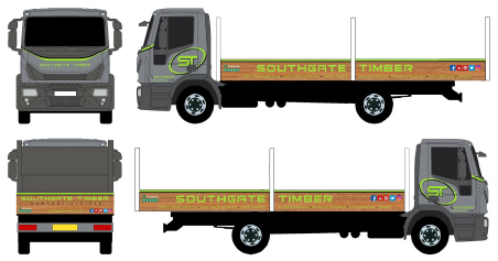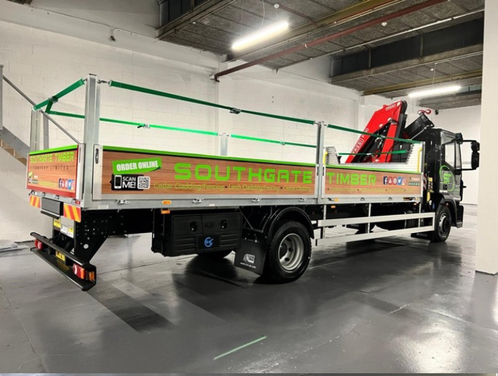 Now this part we got to have some fun with. It was time to make this lorry our own by taking our beloved Southgate Timber colours and designing something eye catching and memorable. We wanted people to be able to take a glimpse at this lorry, even from afar, and know that Southgate Timber is here. Something vibrant and bold, a way to make our mark. We played around with it for a while until eventually, we got the design exactly where we wanted it to be.