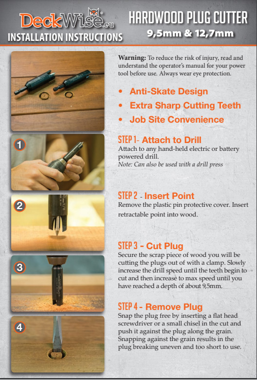 With our hardwood plug cutters in your toolbox, you could easily and quickly cut wooden plugs on site. These plug cutters not only cut wood plugs but are also sharp enough to cut exotic hardwood. The day is saved! The DeckWise® Premium Hardwood Plug Cutter is always the right toolbox addition to complete every job, today, instead of tomorrow.