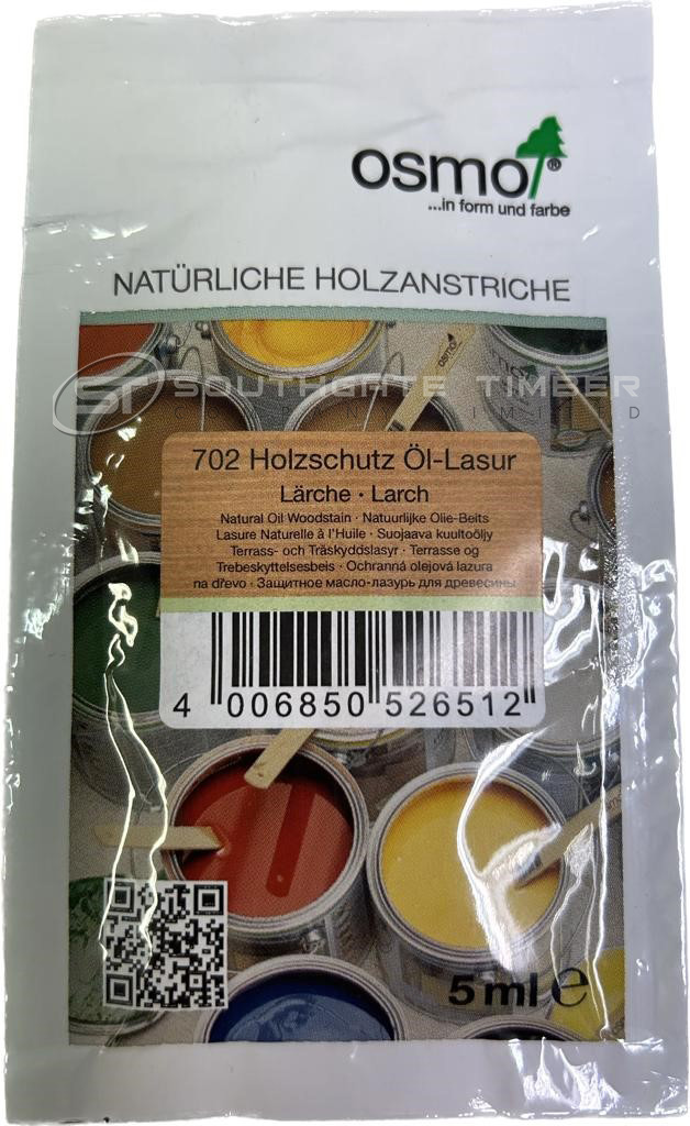- Apply Osmo 702 Larch Natural Oil Woodstain two coat application leave drying time 4 - 6 hours between coats.